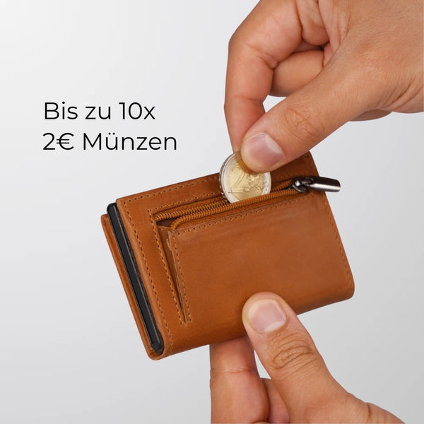 Ein spezieller Schnitt und flexibles Leder machen das Münzfach besonders geräumig und dehnbar. Es fasst bis zu 10x 2-Euro-Münzen und bleibt dank des hochwertigen YKK-Reißverschlusses sicher verschlossen.