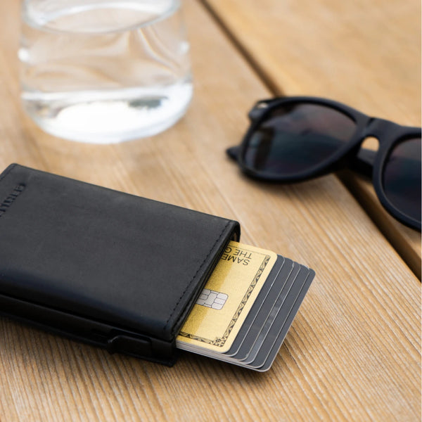 Unser Cardholder verfügt über ein elegantes Echtleder-Scheinfach und bietet Platz für bis zu vier zusätzliche Karten neben den sieben im Aluminium-Case.